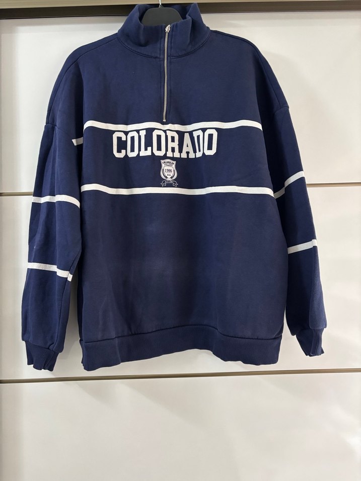 Mavi renkli, fermuarlı ve yakalı kadın sweatshirtü. Uzun kollu, bol kesim ve göğüste "COLORADO" baskılıdır. Yumuşak ve sıcak kumaştan, günlük kullanıma uygundur.