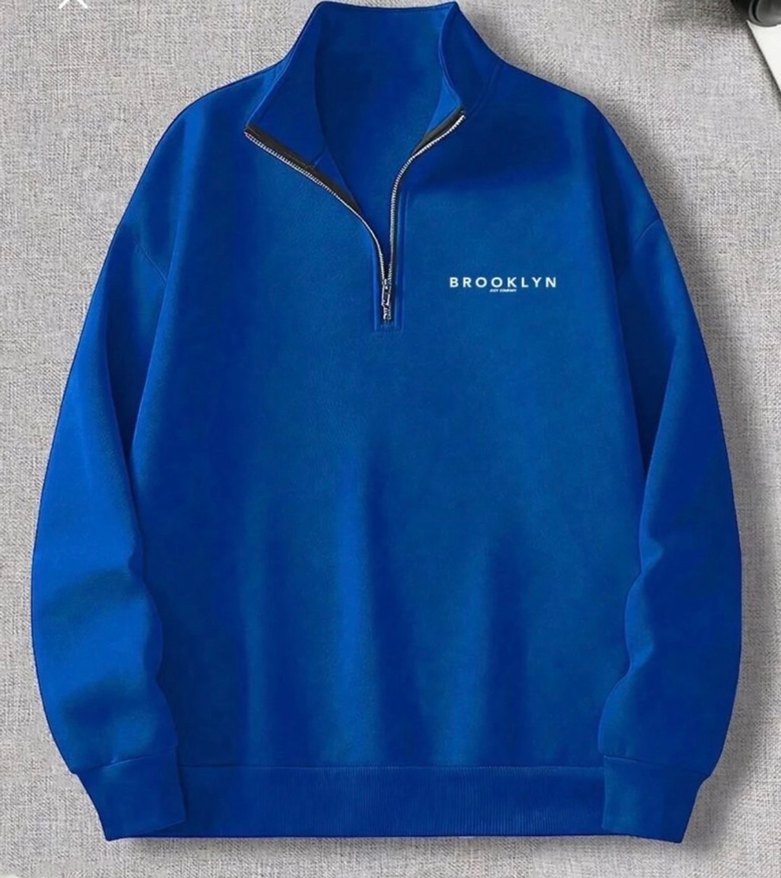 Yumuşak ve sıcak kumaştan, uzun kollu, fermuarlı bisiklet yaka, bol kesim mavi sweatshirt. Üzerinde parlak "BROOKLYN" baskısı bulunur. Sorunsuzdur marka temsili xl yazıyor ama s-m uyumludur
