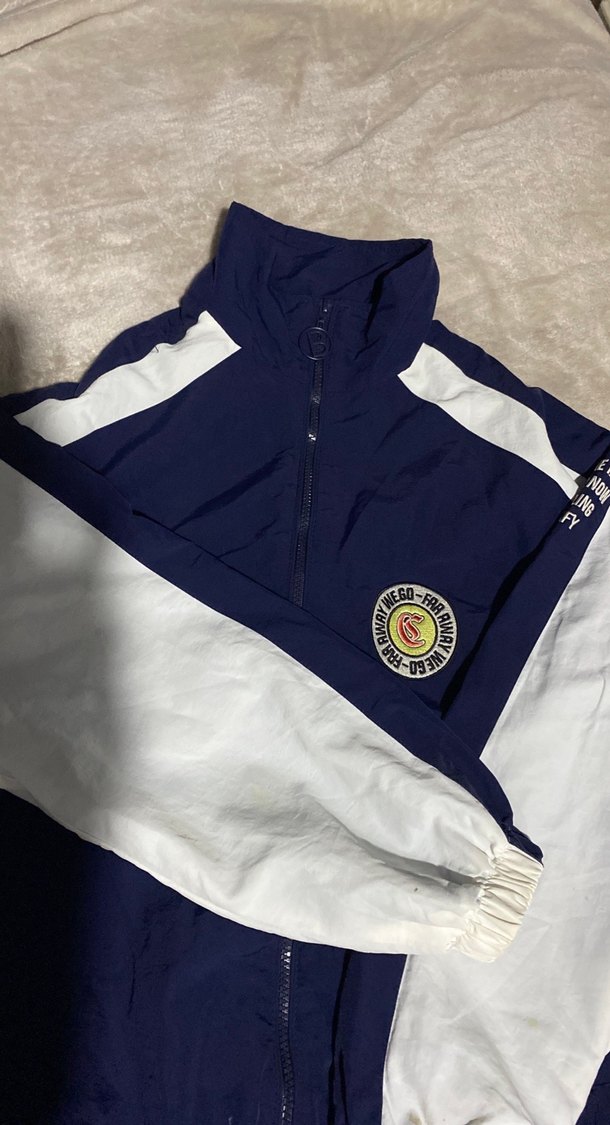 Mavi renkli, fermuarlı ve yüksek yakalı, uzun kollu erkek spor rüzgarlık. Baskılı detaylarla sportif bir tarz sunar.