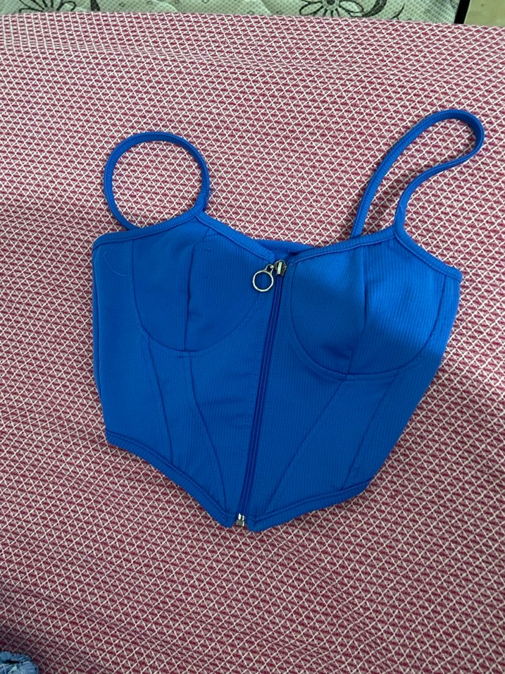 Mavi renk, fermuarlı ve askılı, sentetik kumaştan yapılmış oturan kesim bustiyer. Cesur athleisure tarzıyla dış mekan sokak giyimine uygun.