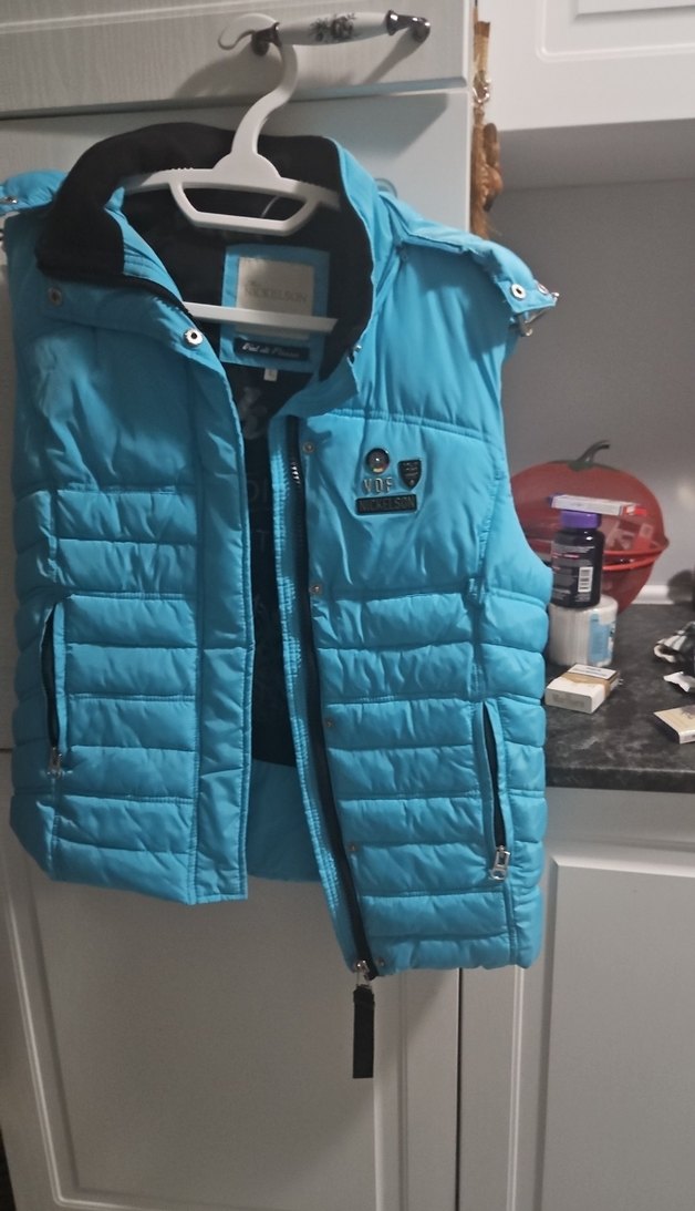 Fermuarlı cepli, yakalı, mavi yeleği. İnce ve sıcak tutan kumaştan, rahat ve şık bir görünüm sunar.