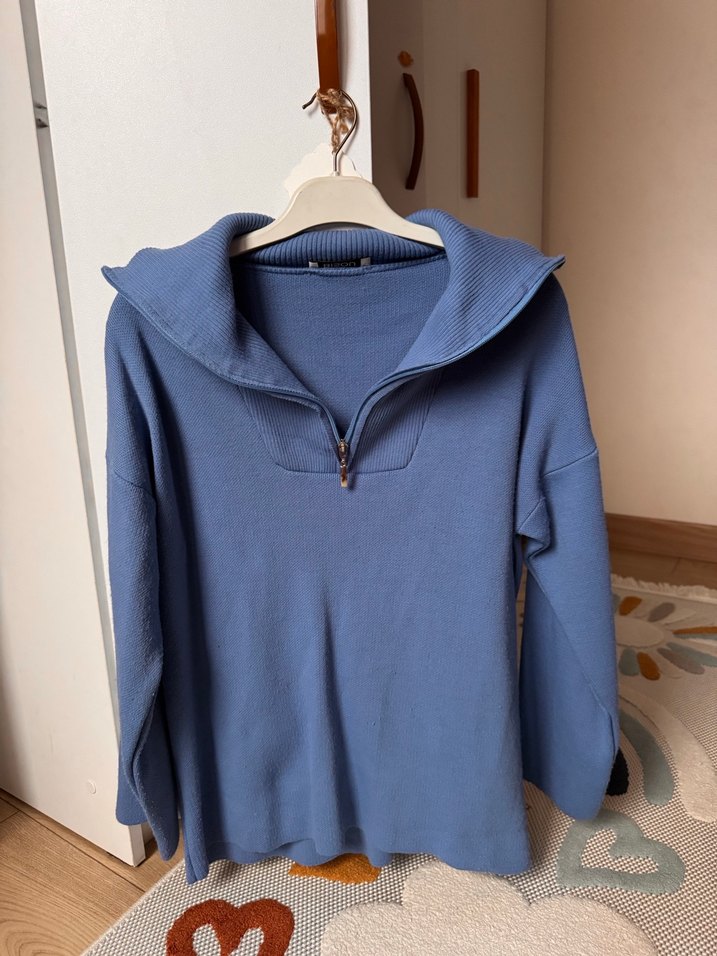 Bir kaç kez kullanıldı temizdir M/L olur Parlak mavi renkte, fermuarlı yüksek yakalı, uzun kollu ve vücuda oturan kadın kazak. Yumuşak ve sıcak kumaştan, günlük kullanıma uygun.