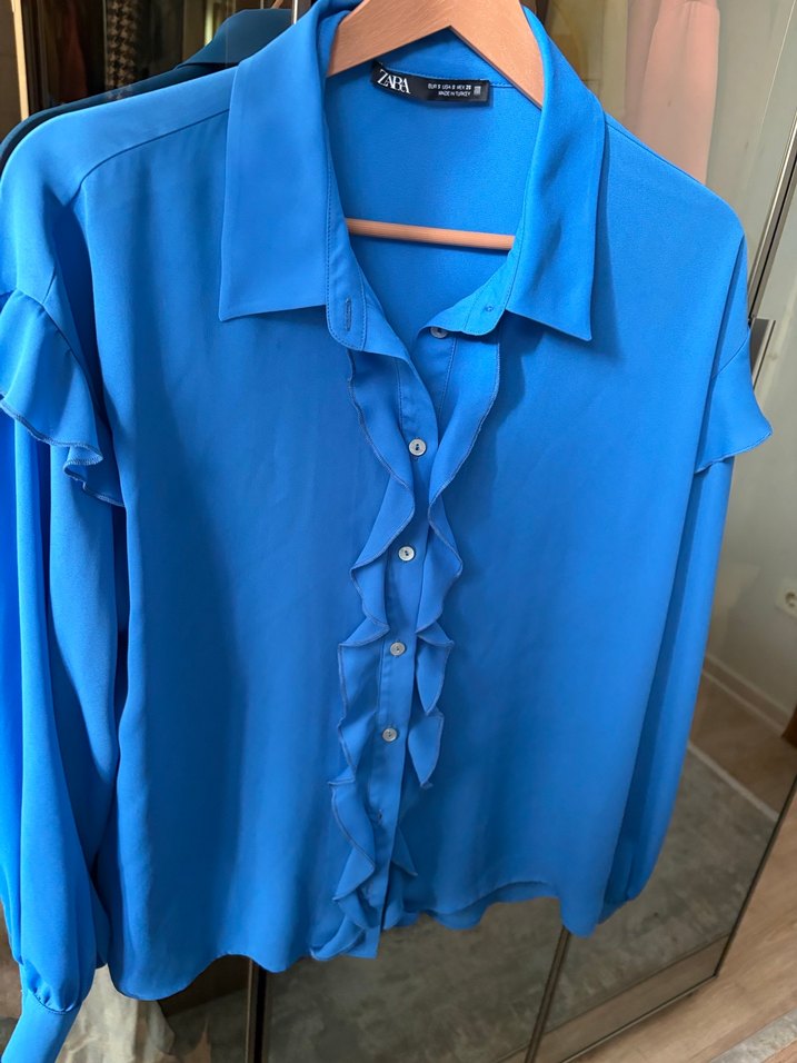Mavi, parlak renkli, saten dokulu, fırfır detaylı, uzun kollu, yakalı ve normal boyda, bol kesim kadın gömlek. Ofis ve günlük şıklık için uygun.