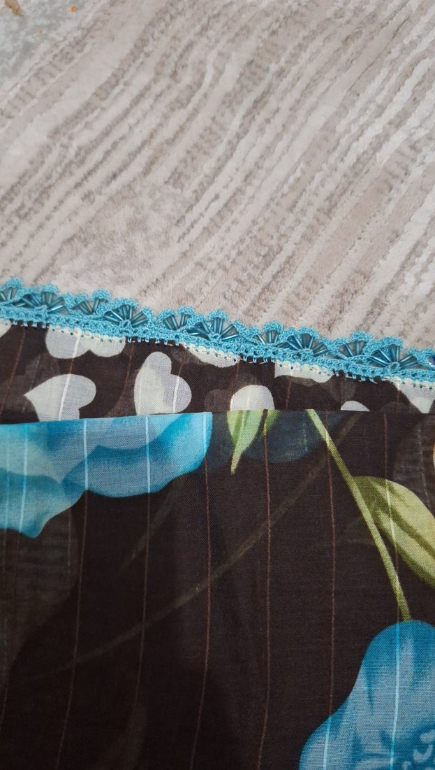 Kadın fular, mavi fırfır detayı ve koyu zemin üzerine çiçek deseni ile bohem tarzını yansıtan yumuşak tekstil kumaştan yapılmıştır.