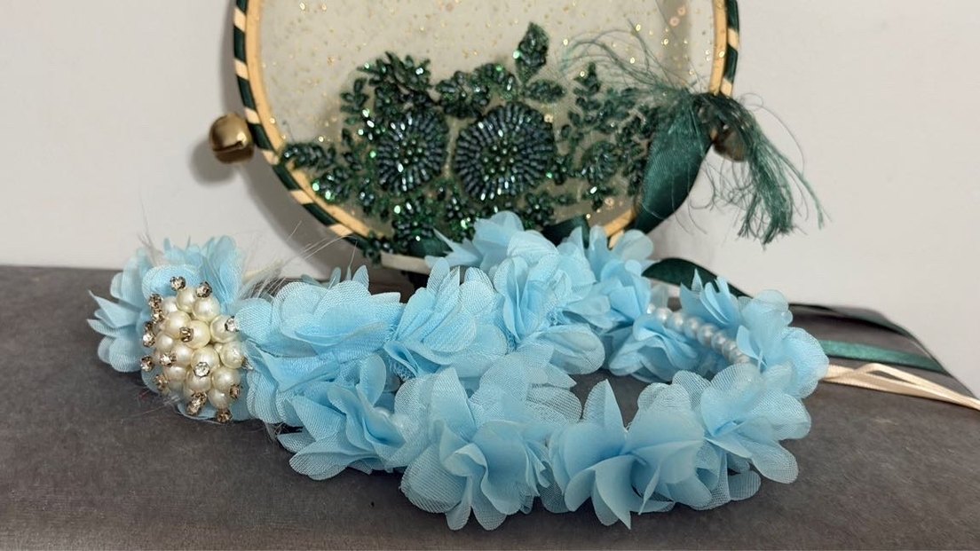 Mavi renkte, sentetik kumaştan yapılmış fırfırlı çiçek detaylı, bohem ve ışıltılı tarzda bir saç aksesuarıdır. İkili şekilde gönderim sağlanacaktır.