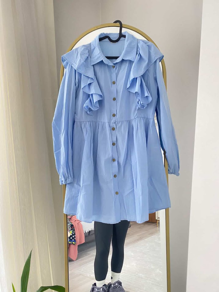 Mavi pastel tonlarda, yumuşak keten kumaştan, uzun kollu, yakalı ve önde fırfır detaylı bol kesim hamile bluzu. Günlük rahat ve Paris sokak stili uyumlu.