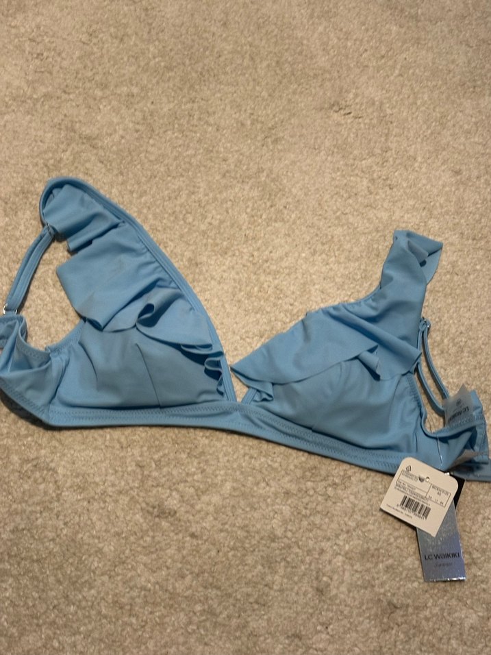 Mavi renkli, ipli kol detaylı ve fırfırlı, vücuda oturan bikini üstü. Pastel tonlarıyla plajda şık bir athleisure tarz sunar.