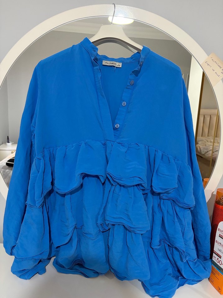 Mavi keten kumaştan, uzun kollu, V yakalı, bol kesim ve parlak fırfır detaylı bohem Paris tarzı kadın bluz.