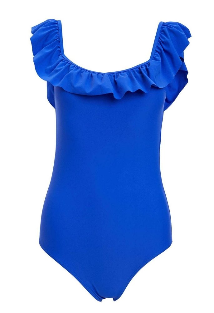 Mavi renkte, fırfırlı detaylı, askısız ve vücuda oturan kadın mayo. Midi boyda ve minimalist cesur bir tarz sunar.