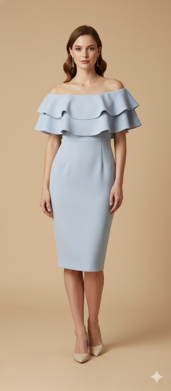 Fırfırlı kayık yaka, pastel mavi renkli, kalem kesim midi elbise. Kolsuz ve yumuşak sentetik kumaştan, ofis için uygundur.