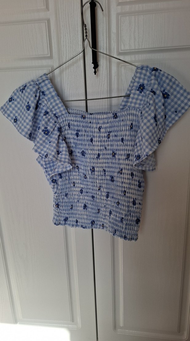 Mavi bluz, kısa fırfırlı kollara ve kayık yaka detayına sahip. Bol kesimi ve batik desenleriyle bohem, retro tarzını yansıtıyor. Günlük kullanım için uygun.