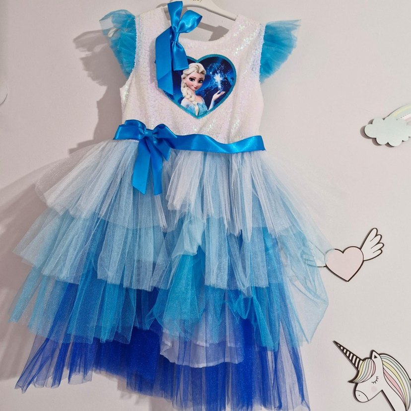 Mavi, fırfırlı ve renkli baskılı kız çocuk elbisesi. Kolsuz, straplez kesim ve bele oturan model. Parlak kurdele ve pop kültür teması içerir.