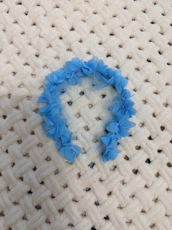 Mavi renkli, sentetik kumaştan yapılmış fırfırlı çiçeklerle tasarlanmış lohusa saç aksesuarı yenidir hiç kullanılmadı