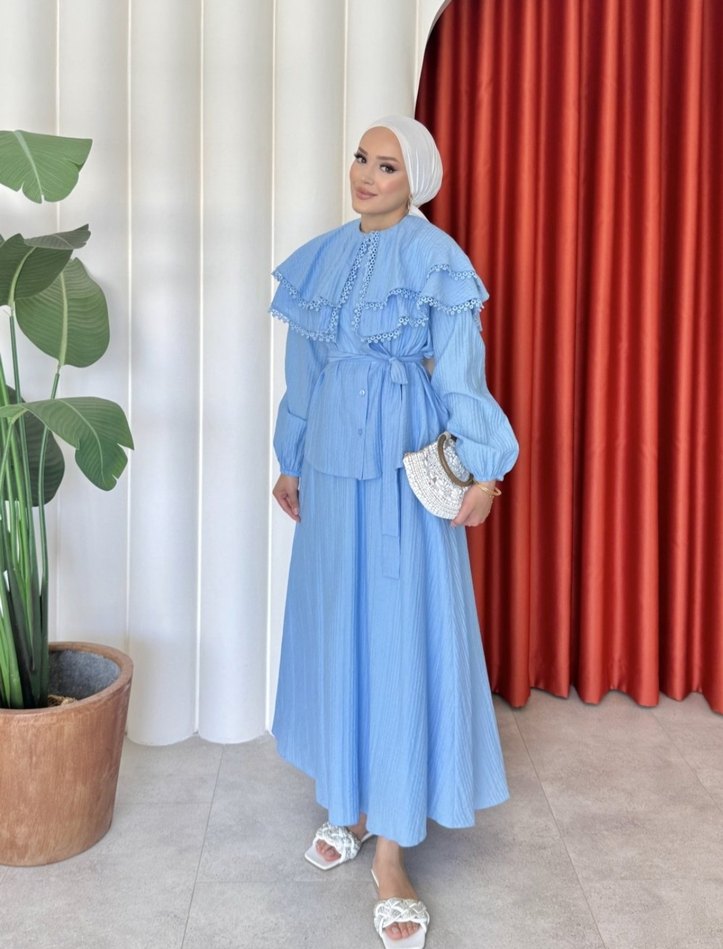 Yumuşak pamuktan, fırfırlı detaylı, yüksek yakalı, uzun kollu ve bol kesim mavi uzun elbise. Bağlamalı bel ve batik desen içerir. Günlük tesettür kullanıma uygun.