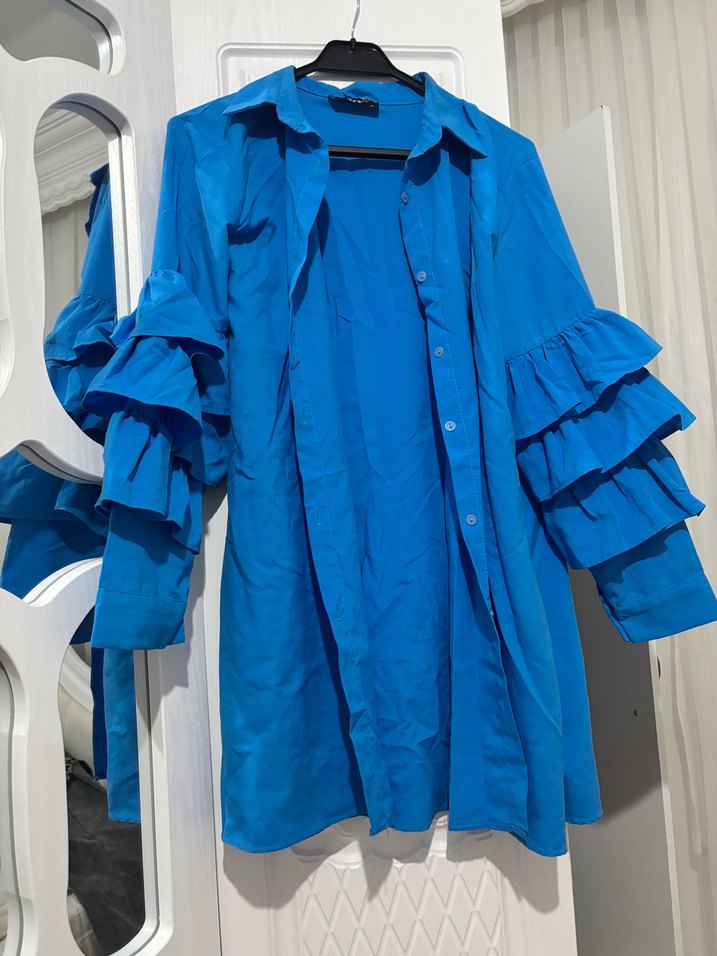 Parlak mavi keten gömlek, uzun kollarda katmanlı fırfır detayları ve kesik yaka ile dikkat çeker. Salaş kesim ve uzun boy ile şık bir sokak stili sunar.