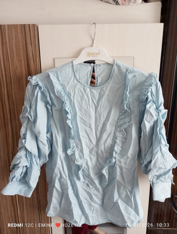 Mavi keten kumaştan, uzun kollu ve fırfır detaylı bir bluz. Salaş, kısa kesim ve pastel tonlarda batik desenlidir. Trendy gündelik tarz için uygundur.
