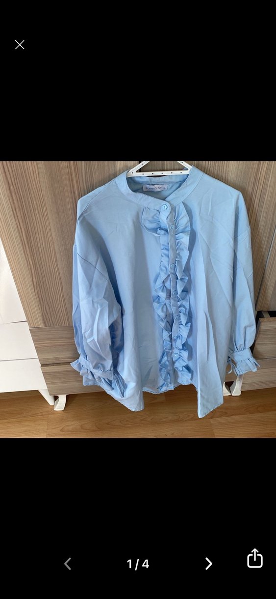 Bol kesim, uzun kollu pastel mavi keten gömlek. Ön ve manşetlerde fırfır detayları bulunur. Yuvarlak yaka ve baskılı desene sahiptir. Casual günlük kullanım için uygundur.