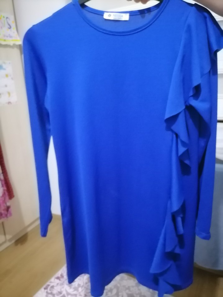 Mavi renkte, uzun kollu, yuvarlak yakalı ve bol kesimli midi tunik. Yan tarafında fırfır detayları bulunur, sentetik kumaştan üretilmiştir, günlük kullanıma uygundur.