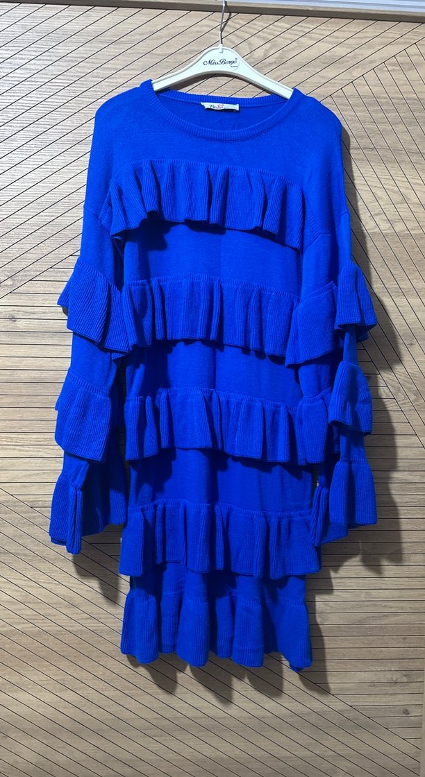 Mavi renkte, sentetik kumaştan uzun triko elbise, çoklu fırfır detayları ve bol kesimiyle dikkat çeker. Yuvarlak yaka ve askılı kolludur, günlük kullanıma uygundur.