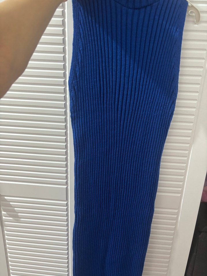 Mavi fitilli triko midi elbise, balıkçı yaka ve ince askılıdır. Yumuşak sentetik kumaştan yapılmıştır ve trend günlük stil için uygundur. S-M-L bedenlere olur