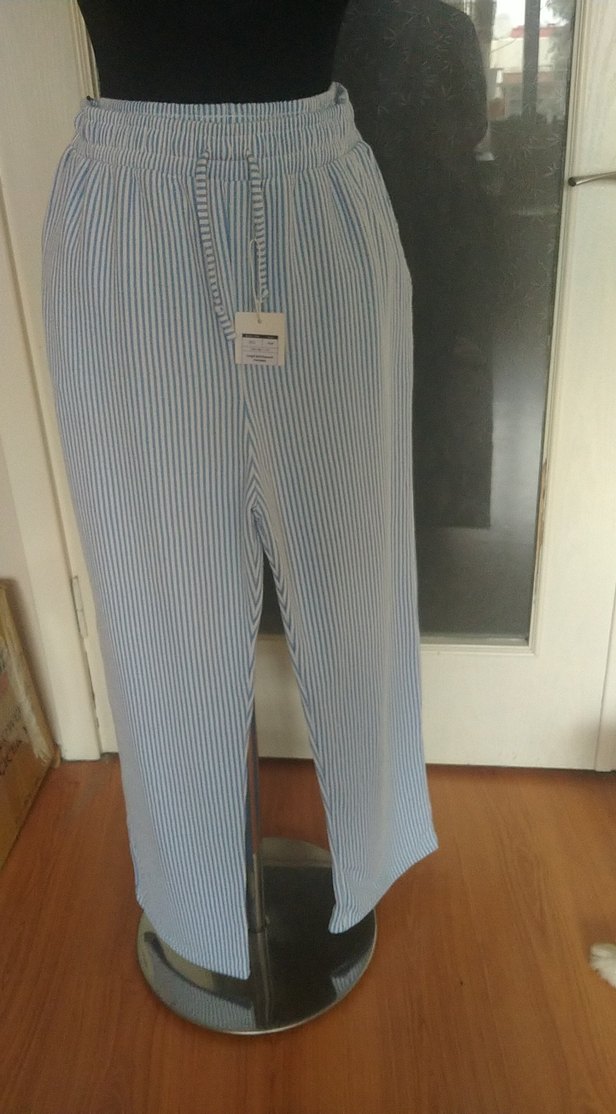 Mavi kot kumaştan, regular fit ve pilili tasarıma sahip midi uzunlukta kadın pantolonu. Günlük kullanıma uygun, rahat ve trend bir görünüm sunar. Hafif çizgili pastel mavi renkli kumaş.