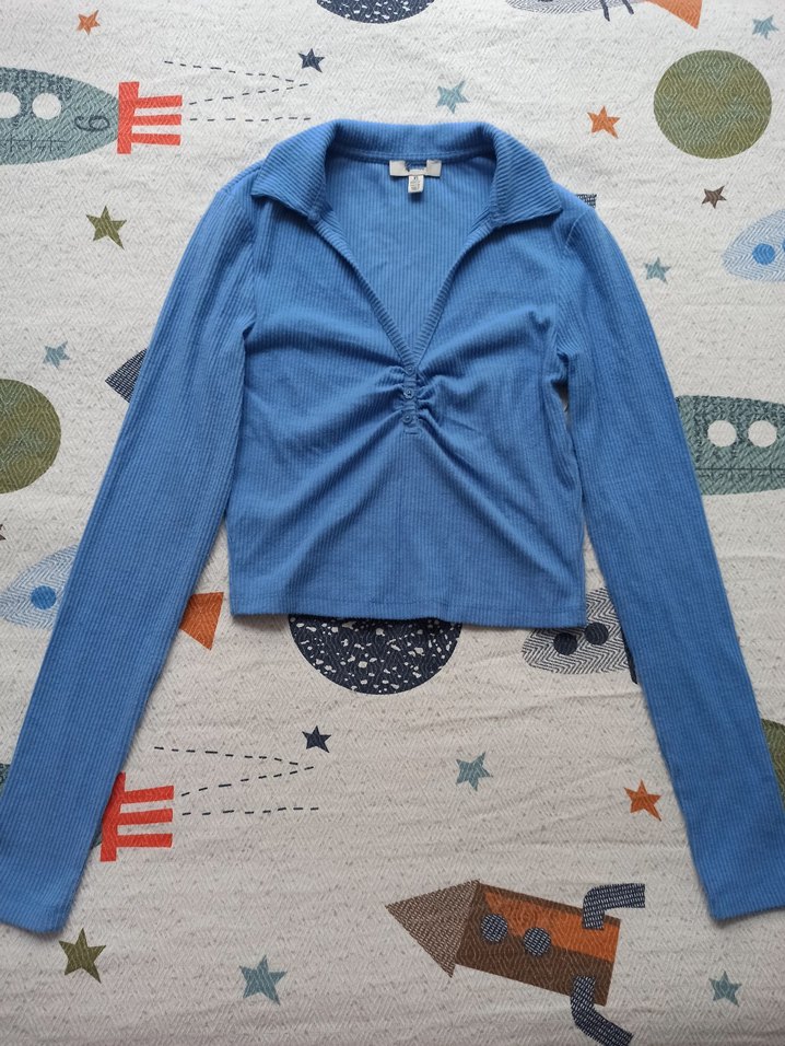 Mavi t uzun kollu ve yakalı, vücuda oturan kesime sahip günlük kullanıma uygun rahat bir bluz hiç giyilmedi