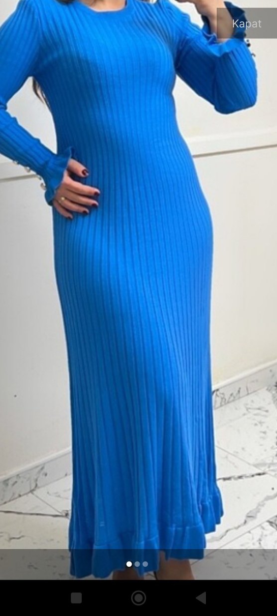 Yüksek yakalı, uzun kollu, fit kesim mavi triko elbise. İnce fitilli yapısıyla klasik ve modern tarzı bir arada sunar. Günlük kullanım için uygundur.
