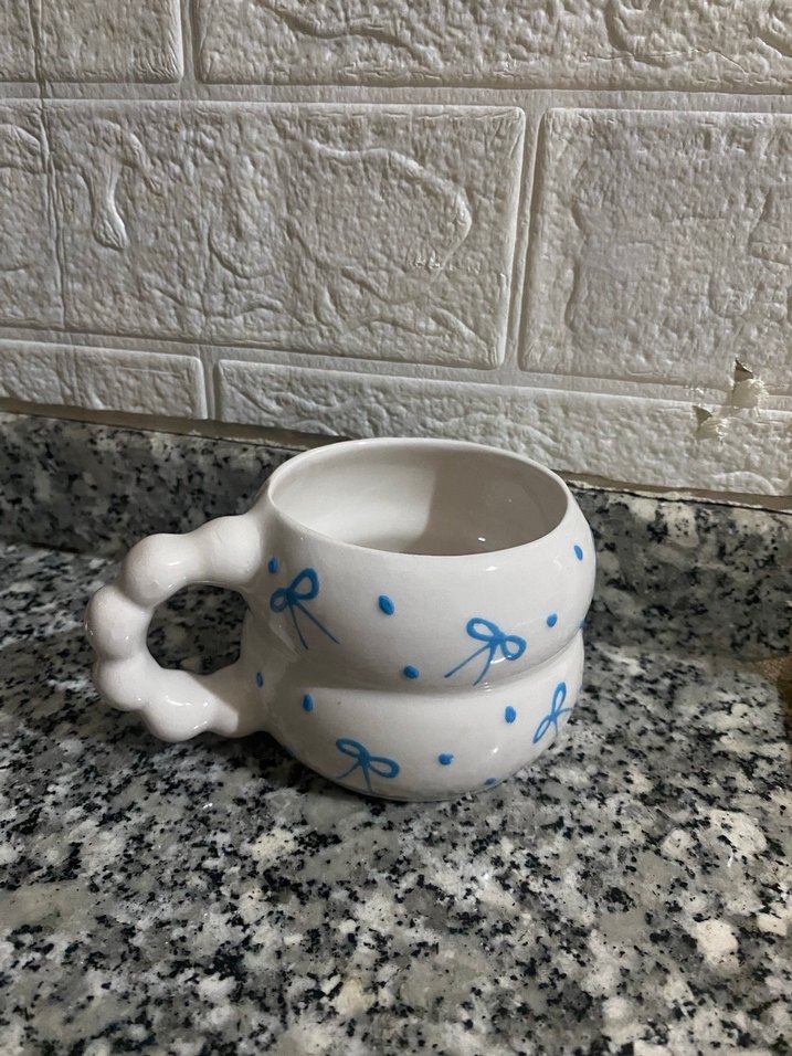 Pastel mavi fiyonk desenli, baloncuk saplı beyaz el yapımı seramik kupa, sıcak içecekler için uygun ☕.