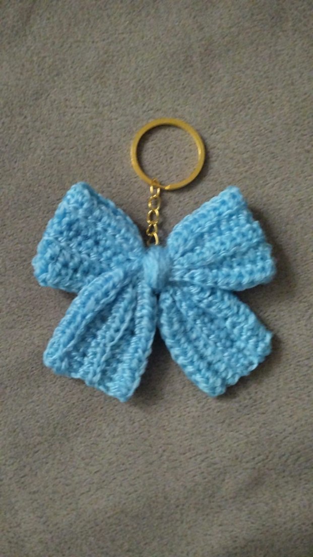 Mavi renkli, el örgüsü fiyonk detaylı bohem tarzda kadın anahtarlık. Altın renkli halka ile tamamlanmıştır. ️