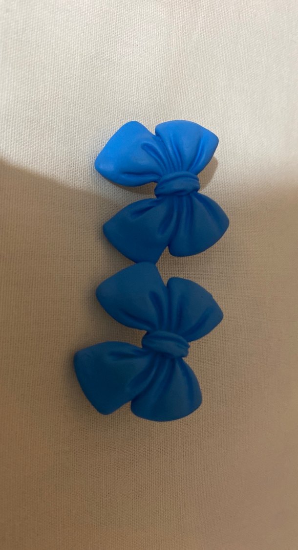 Mavi plastikten yapılmış, fiyonk detaylı kadın küpe, minimalist ve şık bir görünüm için uygundur.