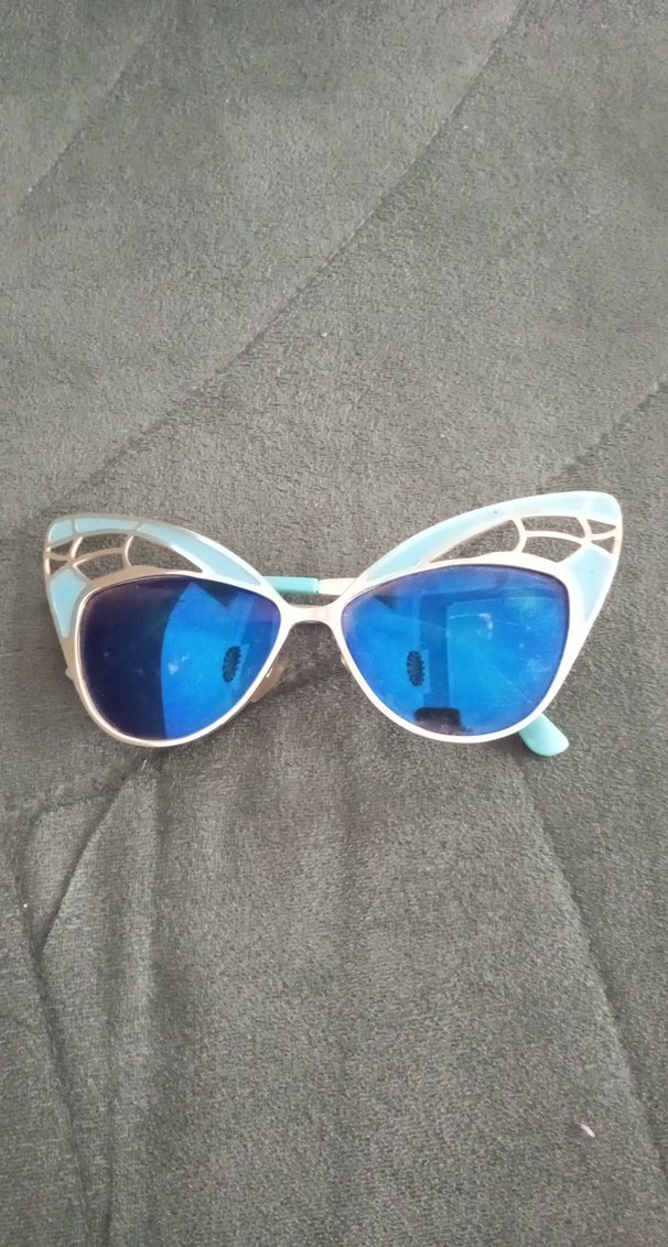 Pastel mavi çerçeveli, fiyonk detaylı retro kadın güneş gözlüğü. Canlı lensleri ve pop kültür tarzı ile dikkat çeker. ️