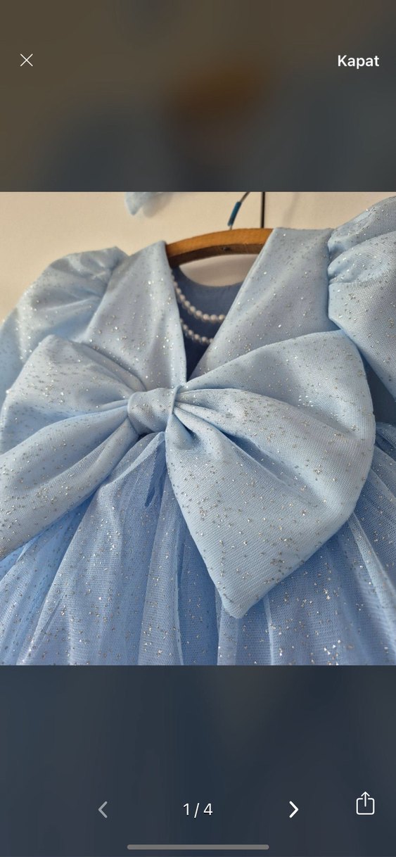 Pastel mavi renkte, büyük fiyonklu ve işlemeli detaylara sahip, yumuşak sentetik kumaştan yapılmış, tekne yaka ve askılı kollu klasik modern tarzda dar kesim kız çocuk elbisesi.