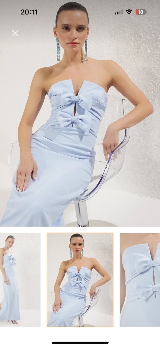 V yaka ve ince askılı, önünde iki fiyonk detaylı, pastel mavi renkli, vücuda oturan uzun elbise. Düğün için uygun, sentetik kumaştan yapılmıştır.