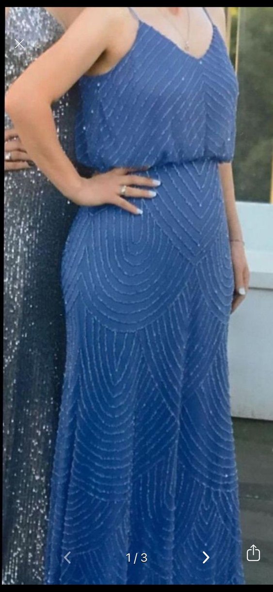 Mavi renk, V yaka ve ince askılı, işlemeli ve boncuklu uzun abiye elbise. Düğünler için şık ve klasik bir tercih. ✨ hafif etek kısmında boncuk dökülmeleri var hiç göze çarpmaz fiyatı uygun tutuyorum.
