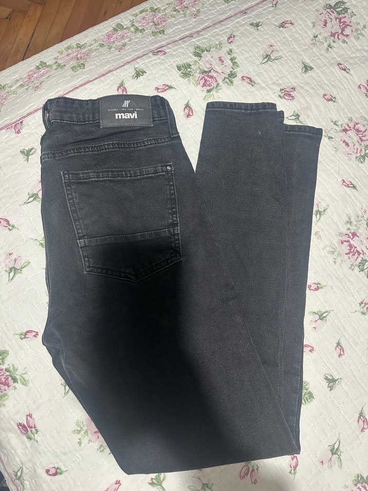 Mavi marka, düğmeli, füme erkek denim pantolon. Regular kesim ve normal boyda, günlük sokak stiline uygun.