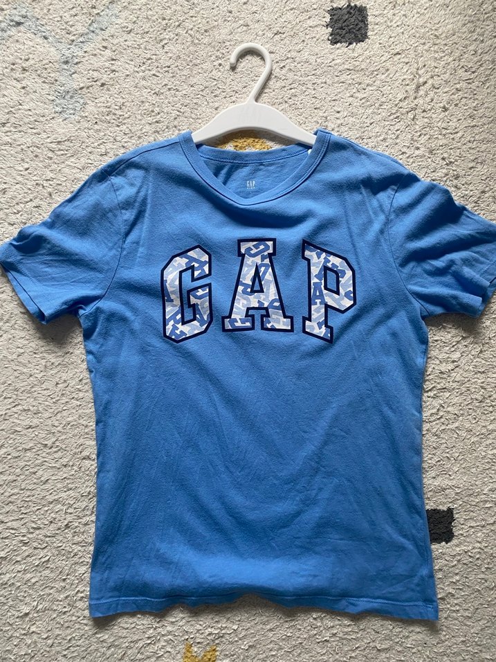 Mavi renkli, kısa kollu, yuvarlak yaka ve bol kesim erkek tişörtü. Denim kumaştan olup önünde pastel tonlarda baskılı GAP logosu bulunur.