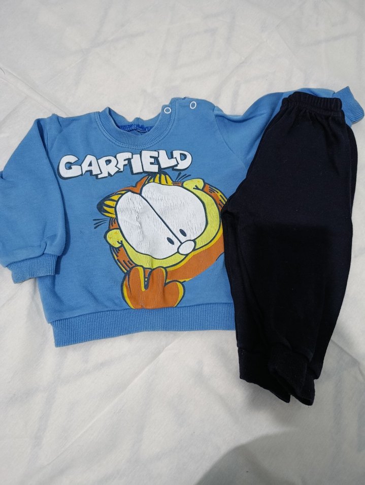 Mavi renkli, Garfield baskılı, uzun kollu, bisiklet yakalı ve kabarık kollu yumuşak kumaştan bebek takım seti, siyah pantolon ile birlikte.