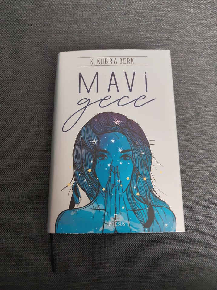 K. Kobraberk'in Mavi Gece adlı romanı, yıldızlarla süslü mavi tonlarda bir kadın illüstrasyonuna sahip.