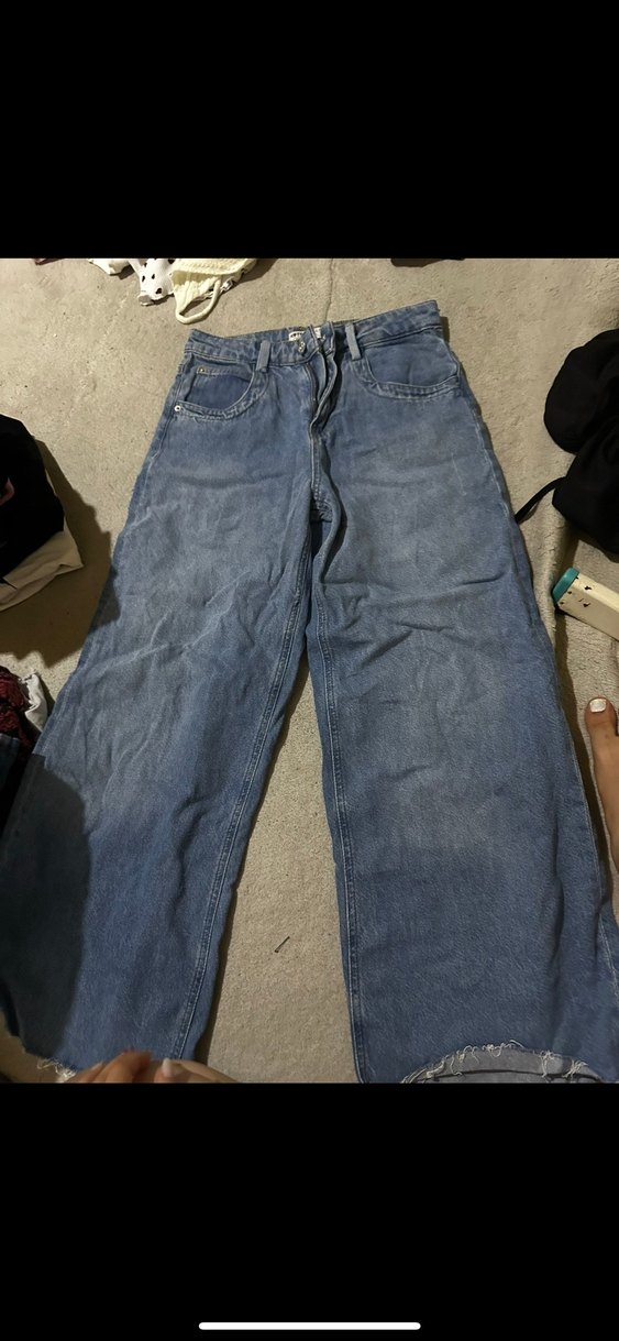 Mavi kot pantolon, geniş kesim ve midi boy. Desensiz, günlük kullanım için rahat ve zahmetsiz şıklık sunar. Minik bi ip kaçması var giyilmedi