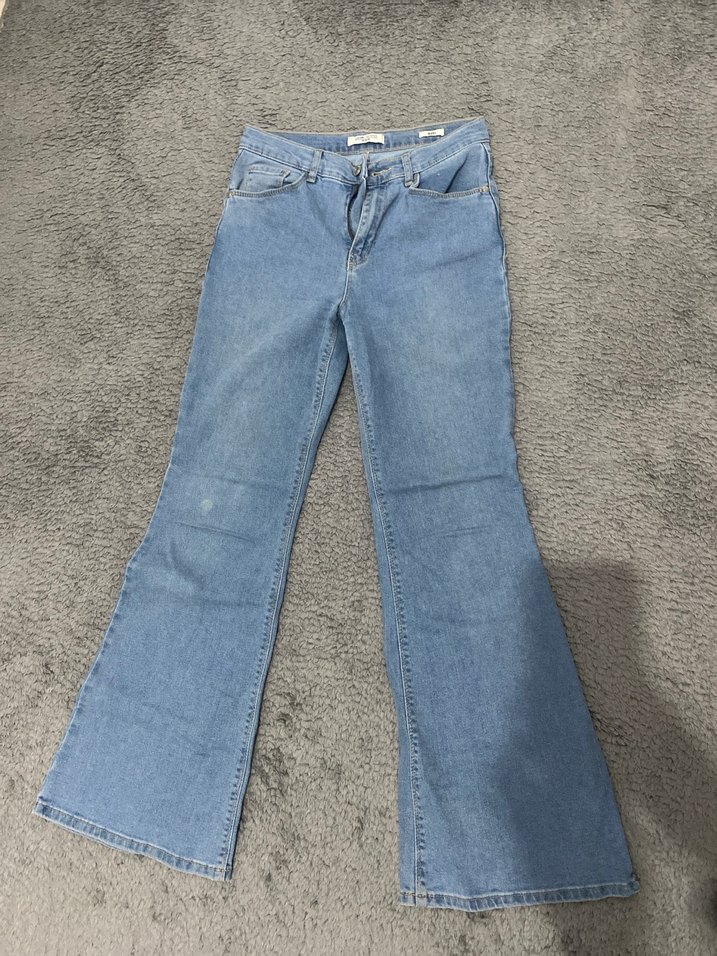 Mavi renkli, geniş paça ve midi boy kot pantolon, rahat ve şık bir günlük kullanım için uygundur.