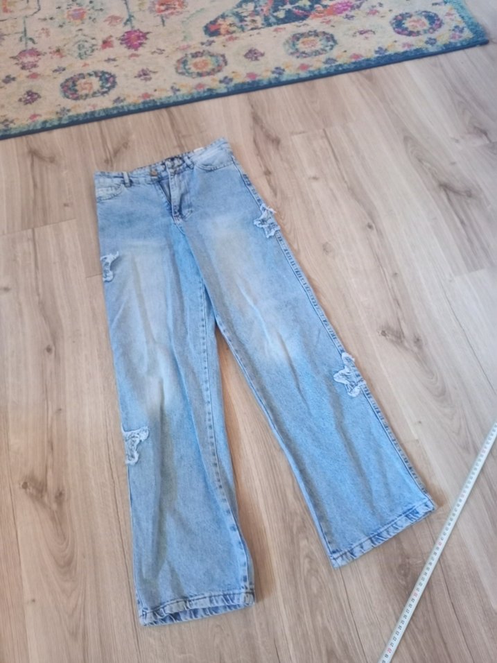 Pastel mavi renkte, gevşek kesim ve midi boy kot pantolon. Günlük sokak stili için rahat ve şık bir seçim.
