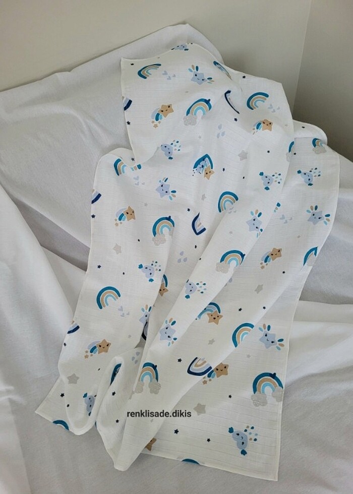 87x100 cm müslin örtü. desenli tek katlı müslin kumaştan dikildi. yüzde yüz pamuklu olduğu için yıkama sonrası 1-2 cm çekebilir.