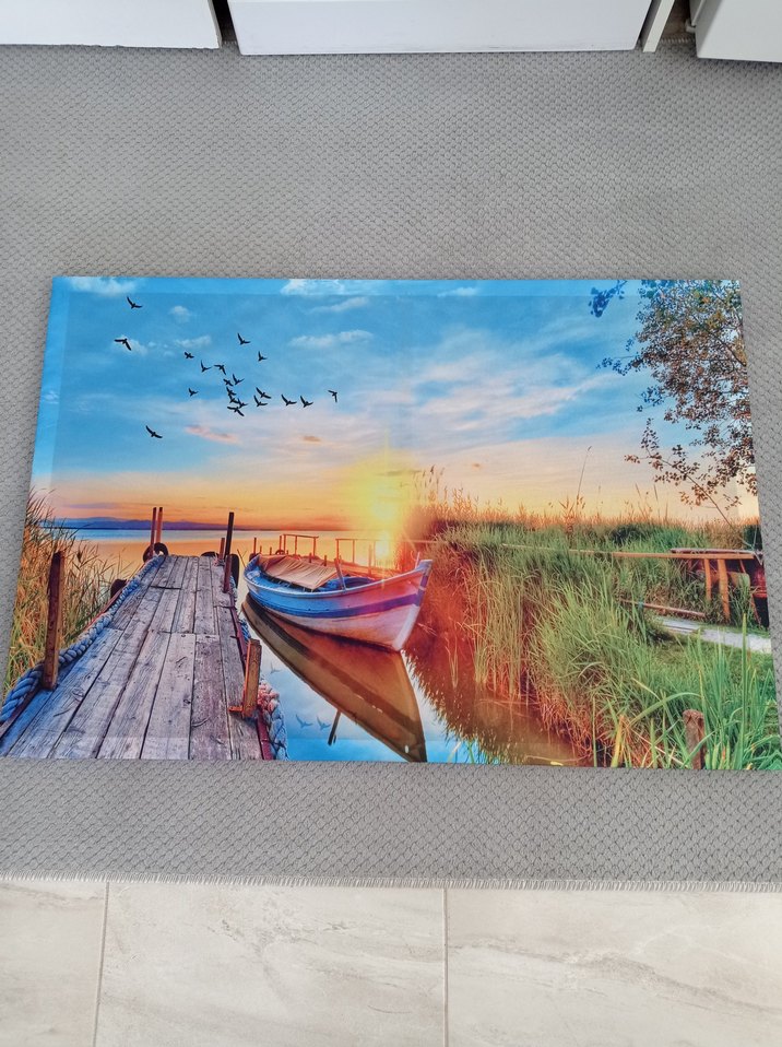 Gün batımında sakin suda tekne ve ahşap iskele ile açık mavi gökyüzünü gösteren tablo. 64x94 cm