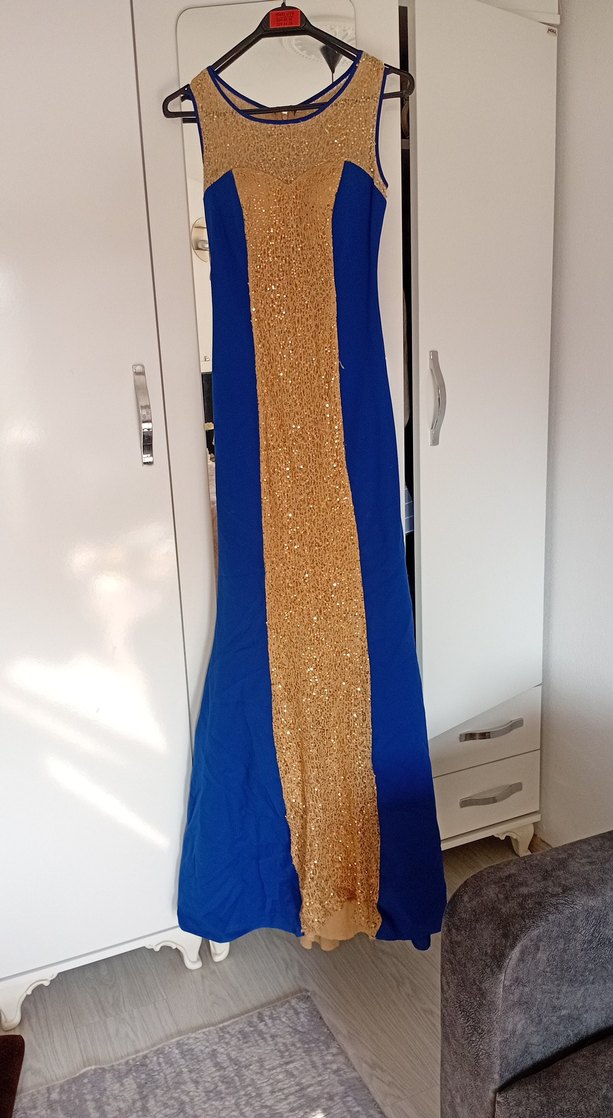 Bu dar kesim uzun abiye elbise, kolsuz ve tekne yaka tasarıma sahiptir. Ortada parlak altın renginde drapeli detay, yanlarda canlı mavi ile kontrast oluşturur, düğün ve şık etkinlikler için uygundur. ✨ ufak tefek sorunları var görsellerde mevcut, sadece bir kere giydim hiç giyilmedi yıkanma yapılması gerekiyor ben hiç yapmadım.