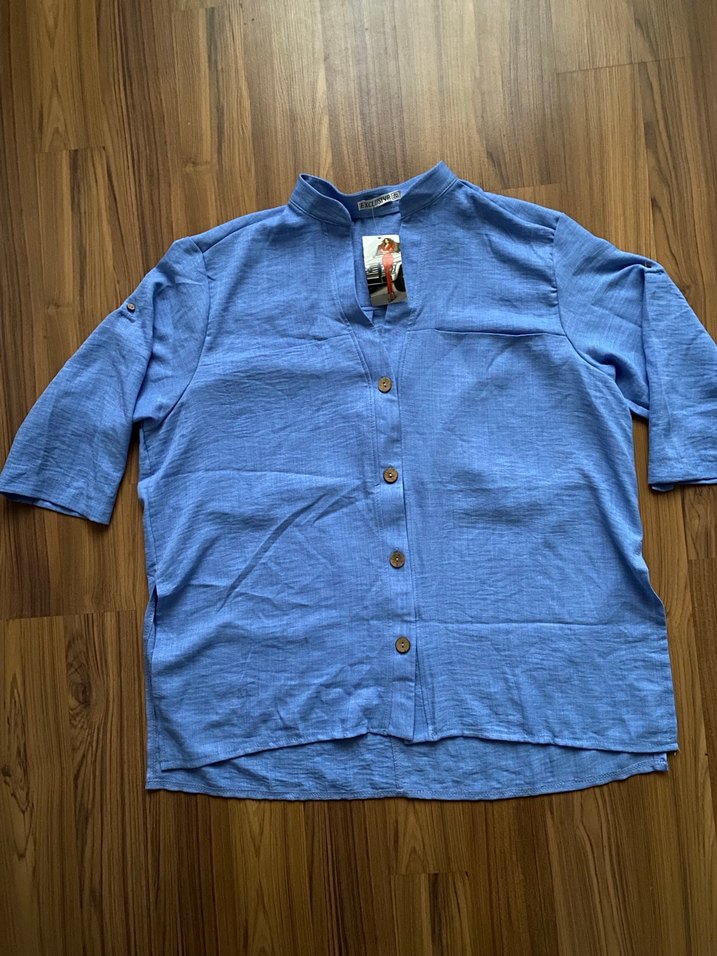 Ön kısmı düğmeli, mavi ketenimsi kumaştan kadın gömlek.