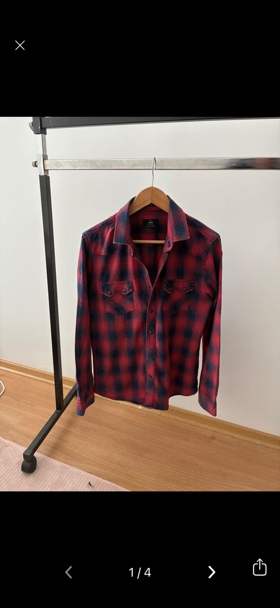 Bu erkek denim gömlek, regular fit ve uzun kolludur. Düğmeli ön kısmı, çentikli yaka ve koyu kırmızı batik desenine sahiptir. Günlük sokak stili için uygundur.