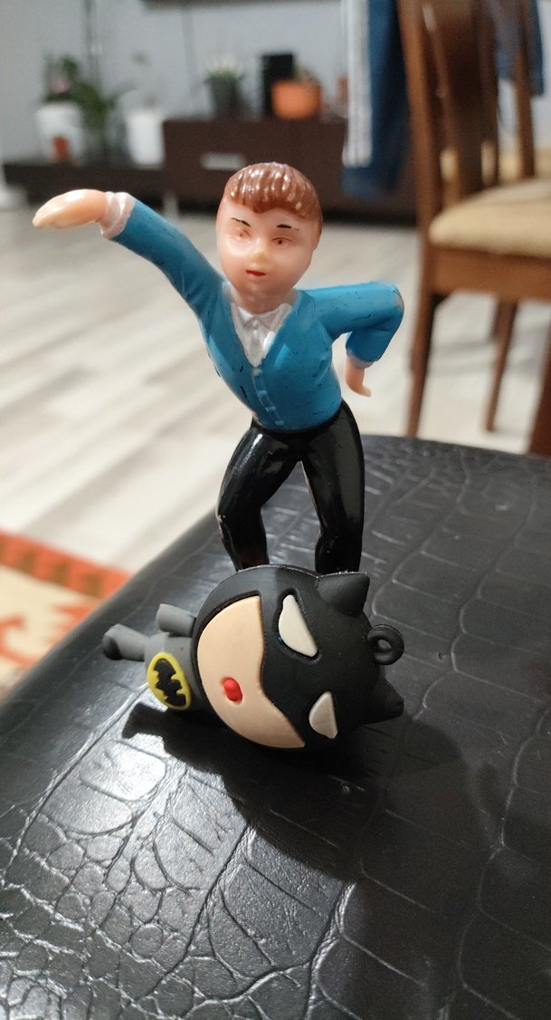 Mavi gömlekli aksiyon figürü ve küçük Batman anahtarlığı, detaylı ve canlı renklere sahip.Batman birilerini kurtarırken bir bacağını kaybetmiştir
