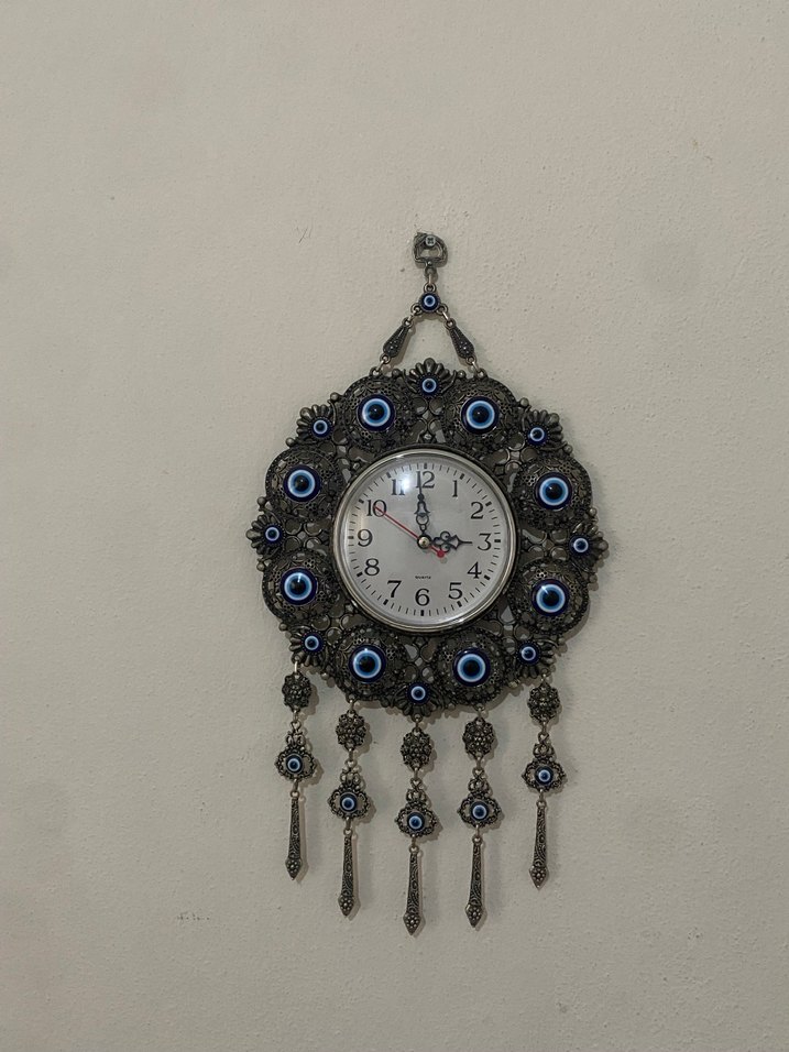 Mavi nazar boncuklu detayları ve sarkan süslemeleri olan gri duvar saati. Kadranında net rakamlar ve vintage tarzı bulunur. ️