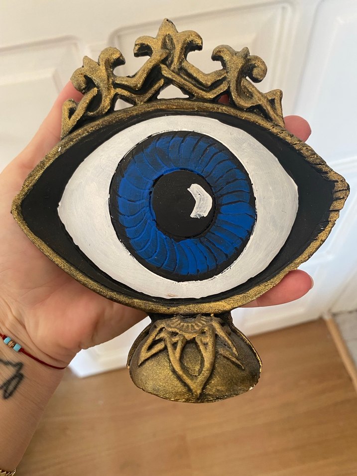 Altın renkli detaylara sahip koyu mavi göz figürlü dekoratif biblo. Canlı mavi iris ve süslü taban ile dikkat çekici bir tasarım.