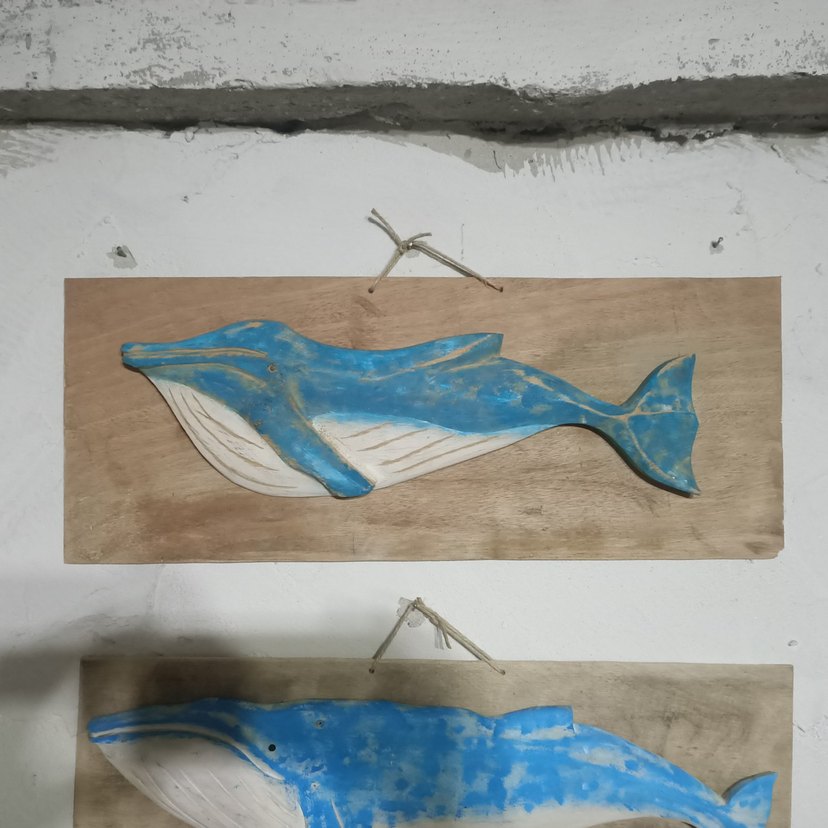 Mavi ve gri renkte, asma ipli ahşap balina dekoru. Deniz temalı alanlar için uygun. 66*26 cm ölçülerinde.